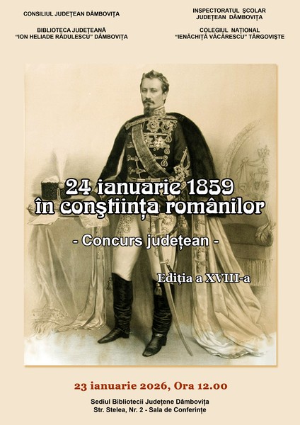 Vineri, 23 ianuarie 2026, orele 12.00, la sediul Bibliotecii Judeţene ”I. H. Rădulescu” Dâmboviţa se desfăşoară concursul judeţean anual dedicat elevilor de liceu „24 ianuarie 1859 în conştiinţa românilor”.