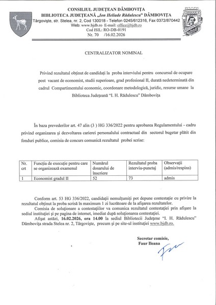 Rezultat obținut la proba interviului pentru concursul de ocupare a unor posturi contractuale vacante