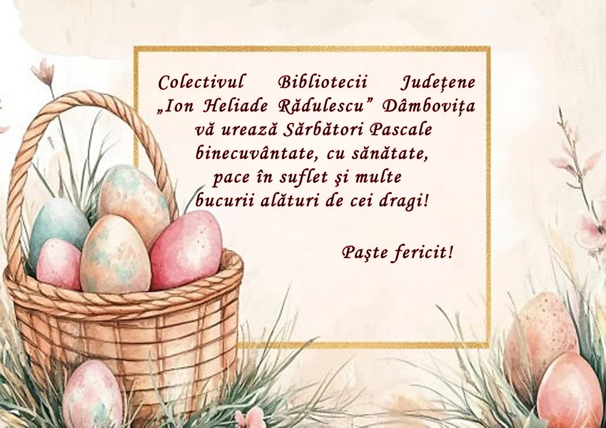 Colectivul Bibliotecii Judeţene „Ion Heliade Rădulescu” Dâmboviţa vă urează Sărbători Pascale binecuvântate, cu sănătate, pace în suflet şi multe bucurii alături de cei dragi!Paște fericit!