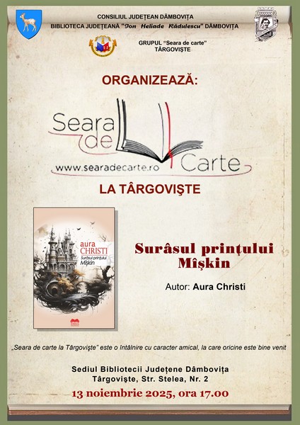 Joi, 13 noiembrie 2025, ora 17.00, are loc o nouă întâlnire „Seara de carte la Târgovişte”, la sediul Bibliotecii Judeţene „I. H. Rădulescu” Dâmboviţa (Str. Stelea, Nr. 2).