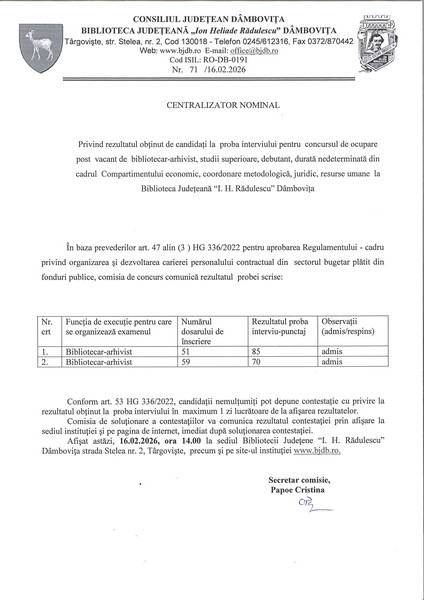 Rezultat obținut la proba interviului pentru concursul de ocupare a unor posturi contractuale vacante