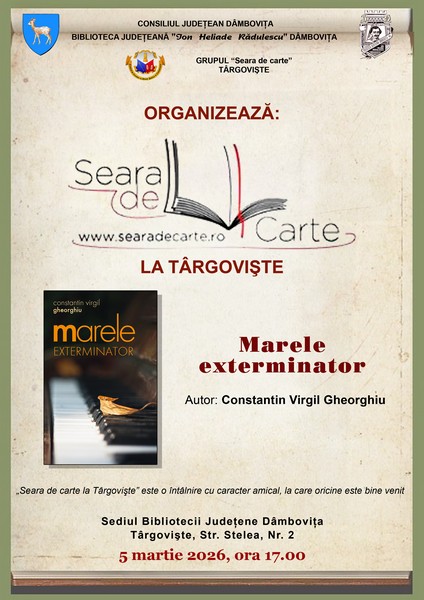 Joi, 5 martie 2026, ora 17.00, are loc o nouă întâlnire „Seara de carte la Târgovişte”, la sediul Bibliotecii Judeţene „I. H. Rădulescu” Dâmboviţa (Str. Stelea, Nr. 2).