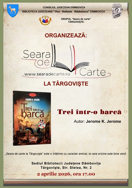 Joi, 2 aprilie 2026, ora 17.00, are loc o nouă întâlnire „Seara de carte la Târgovişte”, la sediul Bibliotecii Judeţene „I. H. Rădulescu” Dâmboviţa (Str. Stelea, Nr. 2).